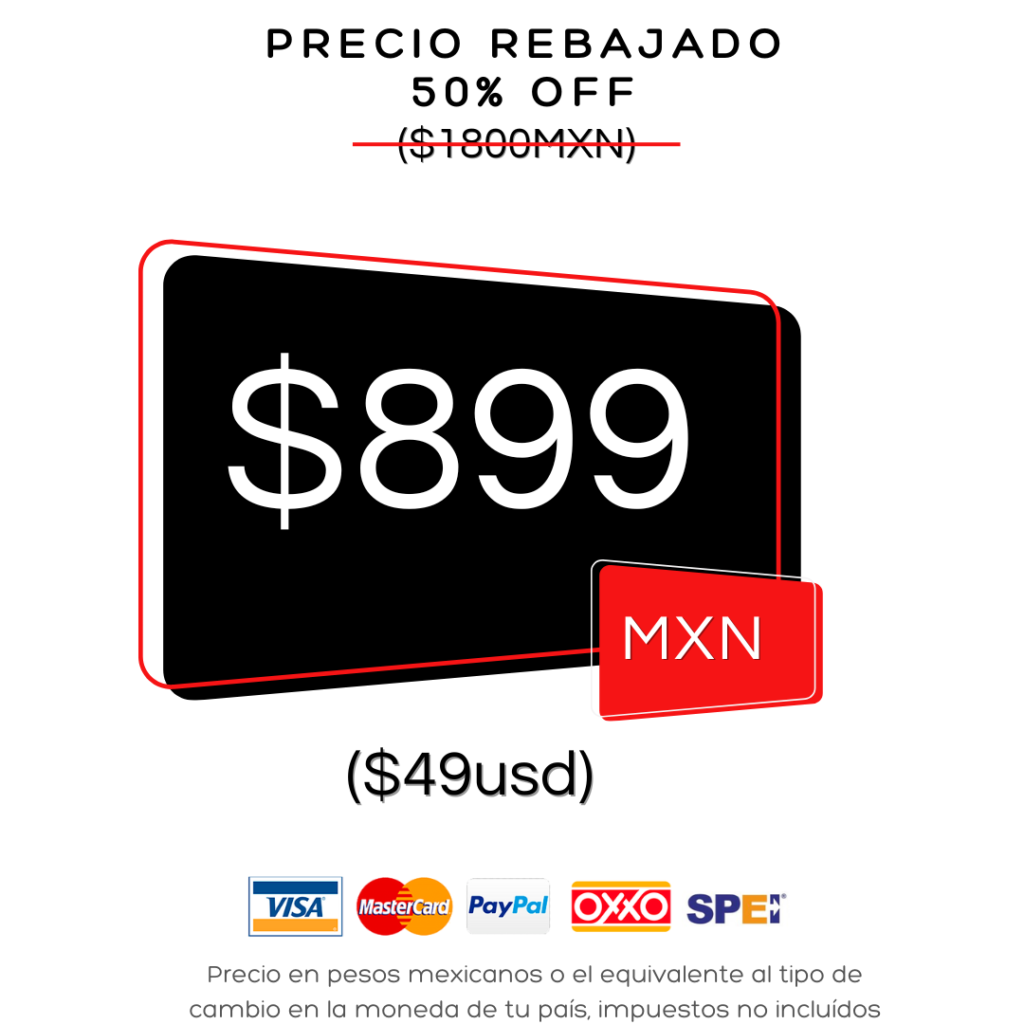 El precio o inversión es muy competitivo, mientras que otros cursos o diplomados pueden superar fácilmente los $400, $500 o hasta los $1,000 USD por tiempo limitado; este curso supera en contenido, calidad y precio a cualquier otro ¡garantizado! ya que está generado a partir de basta experiencia profesional comprobable y no solo de un manual o temario simplificado.